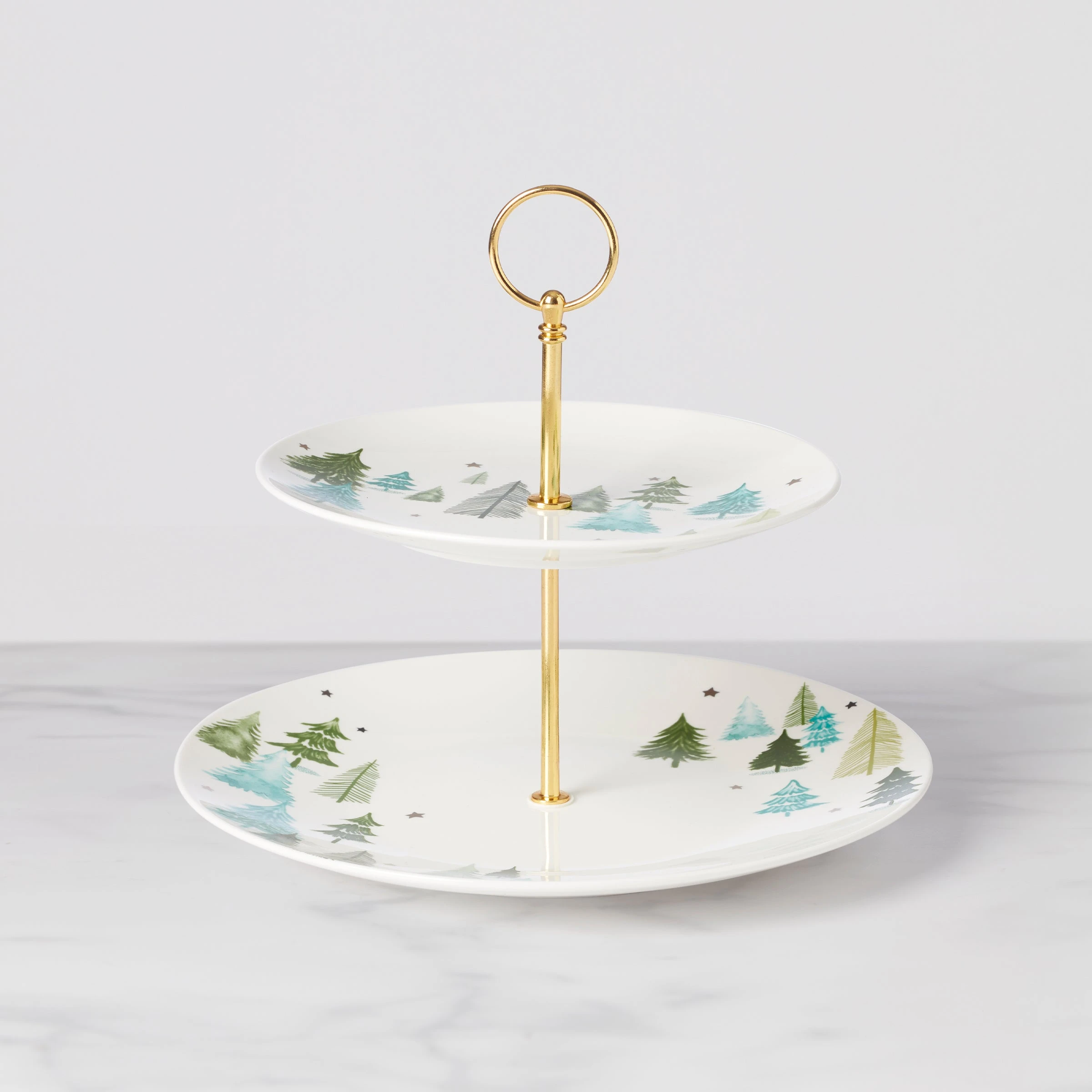 Serve a sweet double-layered dessert. With two levels of plating platforms to fit as many treats as you can carry. Crafted after a wonderful winter wonderland with evergreen trees set against an arctic white scene.