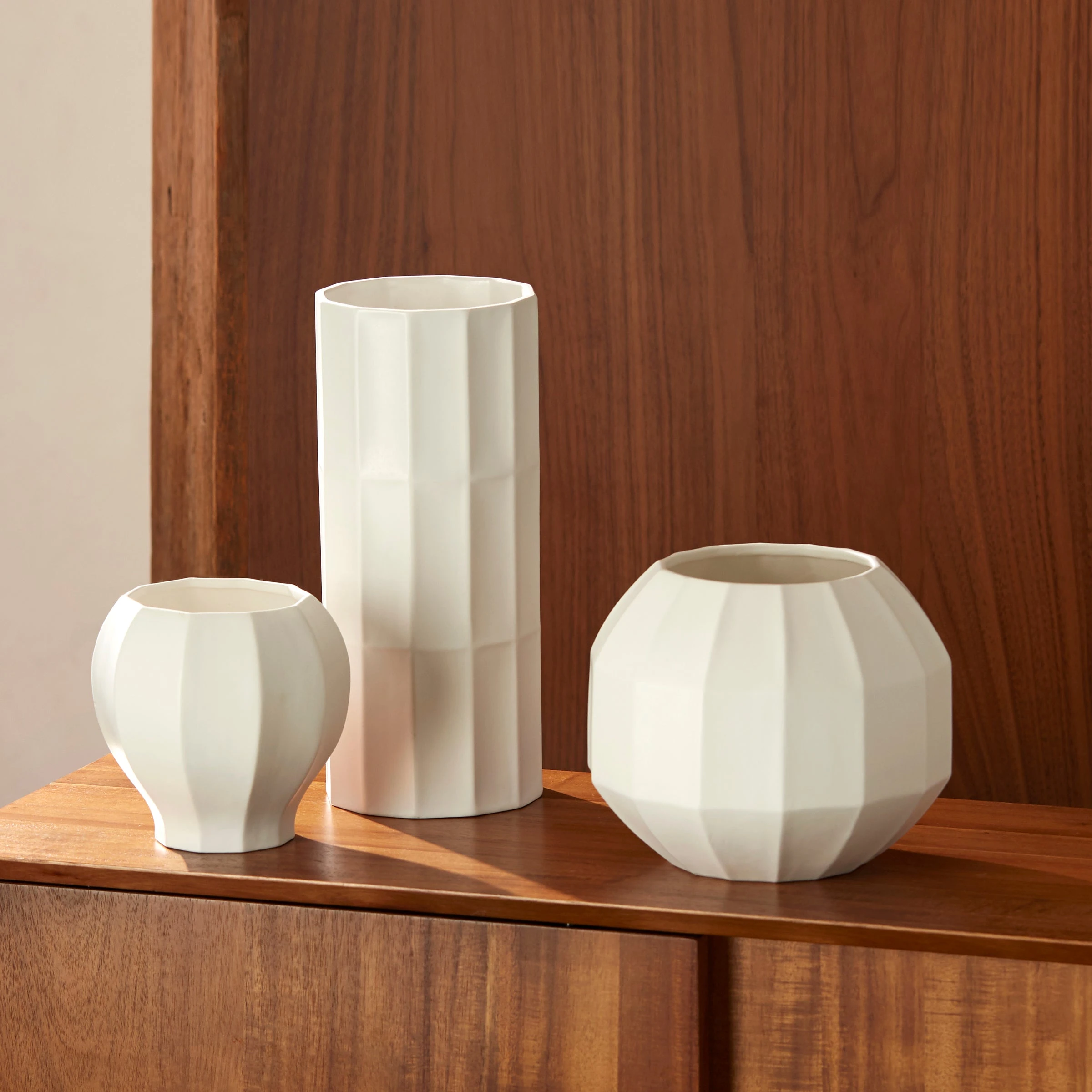 This timeless vase does double duty as a stunning home statement and catch-all accent. Featuring a linear design, its geometric-inspired appearance speaks to modern style. Made of porcelain and finished with a satin glaze.